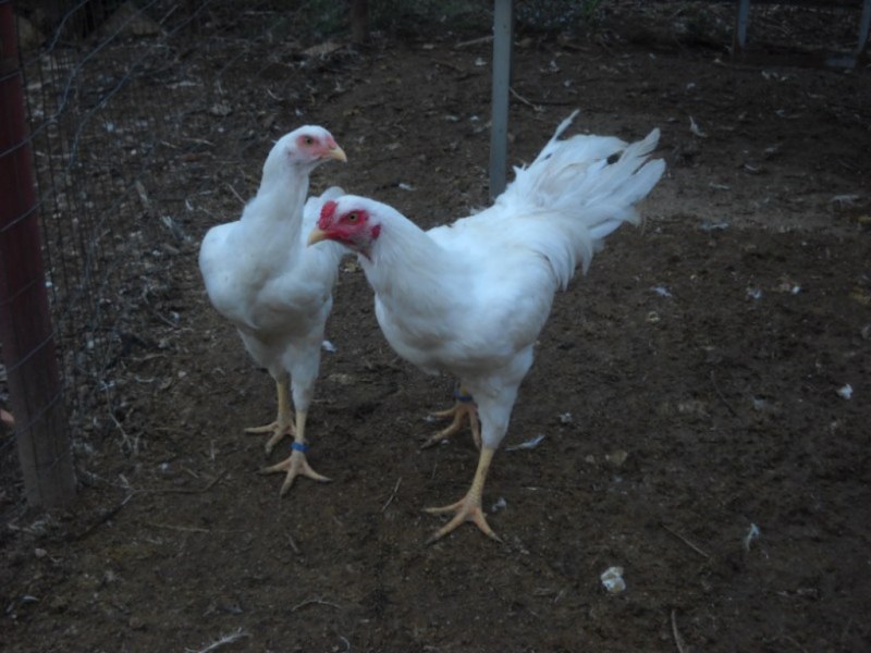 ecco alcuni dei miei satsumadori colorazione bianca nati purtroppo tardi in maggio ed ancora incompleti saranno da rivedere bene a 15/16 mesi ora che scrivo ne hanno 6 e' una razza combattente giapponese una delle tante a coda lunga la sua caratteristica principale e' appeunto la sua coda a ventaglio molto particolare