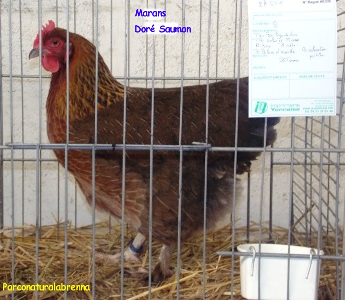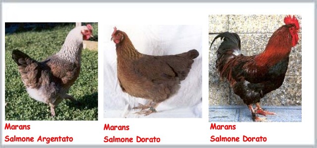 LA MARANS SALMONE-DORATA corrisponde al tipo di colorazione dei gallinacei con pettorina salmone che sono all'origine dei nostri polli domestici attuali, in questo caso la razza originale Bankiva. Essa corrisponde anche, per fare un esempio più concreto, alla nostra Gauloise Dorata.