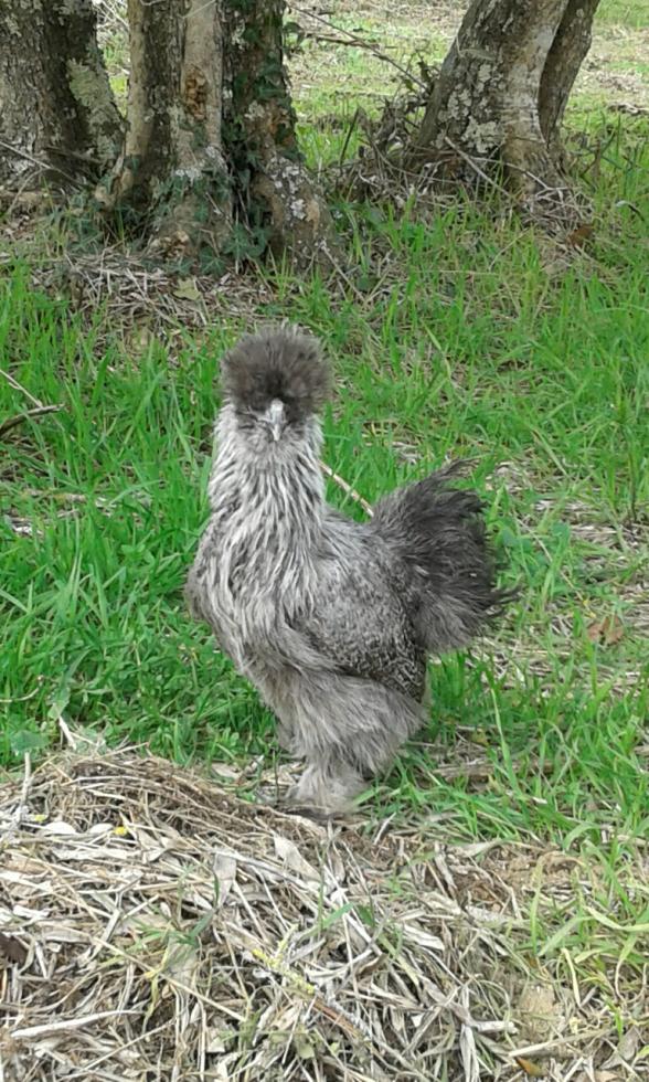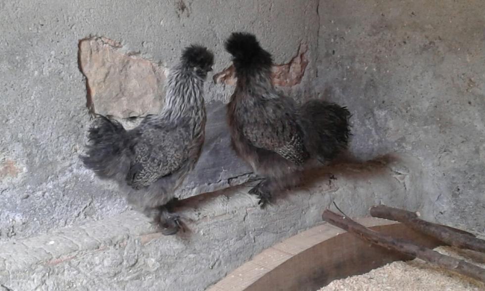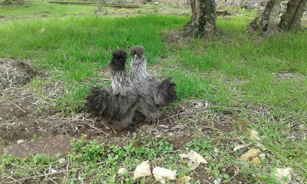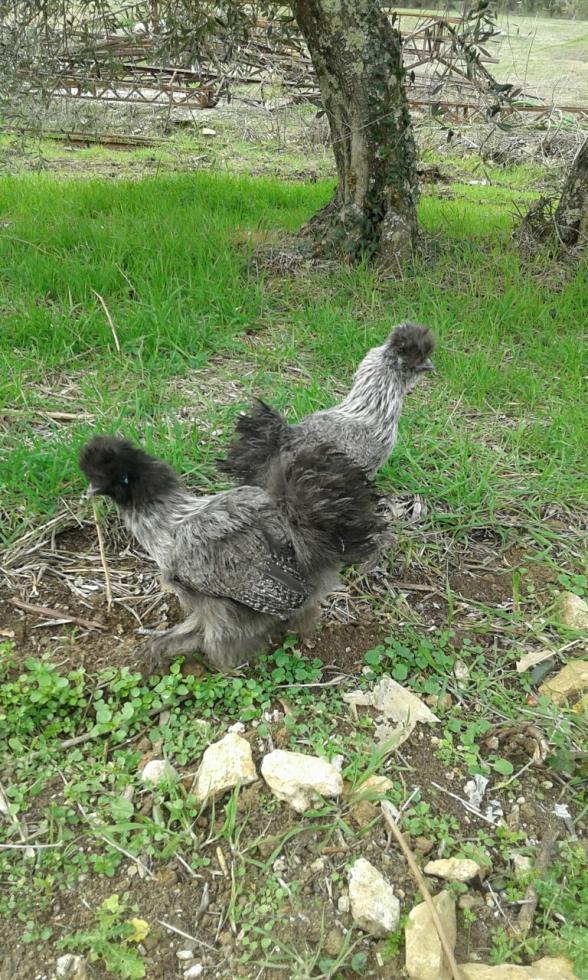 Cari amici... scusatemi per il lungo tempo trascorso senza rispondere, ma questi giorni le cure per il mio tacchinetto malato hanno continuato a prendermi moltissime ore al giorno. Ma ora vi aggiorno sulle mie tenere moroseta e pubblico qualche loro foto... Allora... il tempo è ancora umido e freddo, e preferisco tenerle al chiuso, l'unico giorno di bel tempo è stato quello in cui le ho fatte uscire sul prato, nelle foto che vedete. E' vero che non amano i trespolini tondi, infatti stanno su quella piccola mangiatoia in cemento che vedete in foto. Si lasciano prendere in braccio come gattini... e anche dal prato è stato facilissimo riprenderle per rimetterle nel pollaietto. Perché due femmine... beh... per due motivi. Il primo è che prendendo una coppia ovviamente avrei dovuto mettere in conto qualche nidiata, e avere dei maschi crea qualche problema in più... diversi problemi in più... anche se darei non so cosa per assistere alla nascita di pulcinelli. Ho perfino comprato una bellissima incubatrice, presa dalla foga di far schiudere uova in casa, ma il problema avuto dal tacchinetto, con tutto quello che ha comportato, ha segnato una battuta d'arresto e mi sta costringendo a fare scelte più oculate e meno istintive. Il secondo motivo è che chi mi ha venduto Thelma & Louise mi ha anche correttamente avvertita del fatto che nelle moroseta è difficilissimo stabilire il sesso anche quando sono grandine come queste (che dovrebbero avere circa 4-5 mesi...) e quindi c'è sempre una remota possibilità che scappi fuori un "moroseto"  Staremo a vedere più avanti, ma a voi cosa sembrano, due femmine? Quindi le ragazze sono delle "perniciate argento", ho capito bene? Sono del tutto inesperta e mi fa piacere imparare quanto più possibile... Per esempio, di giorno si mettono appollaiate sul bordo di quella mangiatoia di cemento, arrotondata e larga, ma la notte continuano a dormire in una scatola che tengo in un angolo del pollaio, vicine vicine... Ho anche messo loro una cassettina con la paglia, ma non ci vanno. Solo che così spesso dormono sopra i loro escrementi, e non va bene... che consigliate? Grazie, ragazzi..