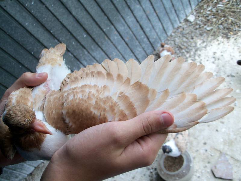 Alcune foto dei miei piccoli nati  : Premetto che la macchina fotografica ha deciso di non avere più carica quando era il momento di fare le foto ad ali chiuse; quindi le 2 che metterò sono di più di due settimane quando erano ancora giovani  e tutte non sono scattate nelle condizionimigliori per valutarli Partiamo con il pietrascura, mi dicono che bisognerà aspettare la muta per definirlo con certezza, potrebbe diventare tutta spalla o trigano, ha qualche penna colorata nel petto bianco e la linea tra la testa e il bianco del busto non è molto regolare  : Allegato: