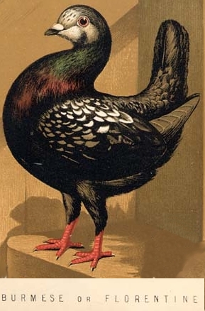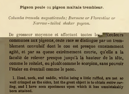 Intanto scavando nella storia di questa razza riporto altri due reperti storici che la riguardano. La prima è di un autore tedesco e l'altra di un famoso autore francese del passato (fine '800), La Perre De Roo. In quest'ultima viene riportata la stessa immagine del libro del Bonizzi, l'originale è la litografia del Fulton. Le sue litografie venivano spesso utilizzate nei libri di colombicoltura di fine '800, inizio '900. Nella descrizione di La Perre De Roo il disegno di Fiorentino odierno (gazzo) viene presentato come la varietà più bella dell'allora "Pigeon Poule" o "Pigeon Maltais Trembleur". La rappresentazione infatti sembra essere quella della varietà principale. Il motivo per cui in altri testi questa rappresentazione viene riportata come Fiorentino potrebbe risiedere proprio nel fatto che all'epoca non ci fosse una netta distinzione (come la intendiamo noi oggi) tra le diverse varietà...