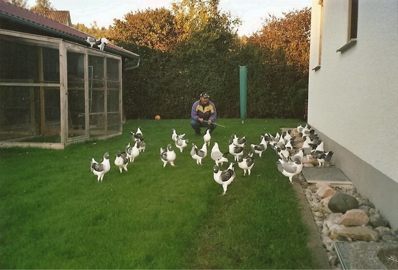 Salve a tutti, l' esperienza di Wasserburg è stata veramente positiva: colombi di tutte le razze, colori, molta seconda scelta ma anche delle ottime occasioni nascoste nel mucchio. La cosa che più mi ha impressionato però è la quantità di giovani che si interessano di animali, speranza per il futuro dell' allevamento, ma che invidia pensando all' età media dei nostri allevatori !!!! Molti fiorentini disponibili, per cui c' è voluta pazienza e attenzione per scegliere due coppie di buona qualità: ho riportato una coppia di neri ed una di blu vergati. Colombi eleganti ma allo stesso tempo robusti, con petto largo e corpo corto, buona altezza sulle gambe, e ora si parte finalmente !!! Ho conosciuto il presidente del club tedesco, molto gentile e disponibile: il club è lieto che siamo di nuovo interessati al fiorentino, ci comunicheranno avvenimenti e mostre al riguardo, e mi hanno assicurato piena disponibilità se abbiamo bisogno di colombi. Intanto vi posto una foto meravigliosa di un allevatore tedesco della Baviera.