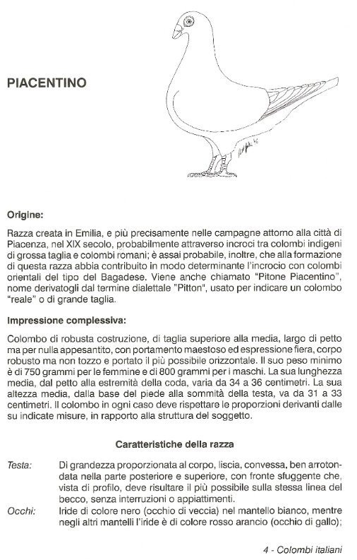 ciao a tutti gli amanti degli animali. Questo post é interamente dedicato al colombo PIACENTINO . animale originario dal paese di cui prende il nome,Piacenza. Questo è un colombo a mio parere molto bello con pochi difetti e di stile. Ottimo nella riproduzione della prole,può essere usato anche come balia per colombi come: romano,sottobanca modenese,mondano ecc. Disponibile oltre al classico comune colore bianco anche Nero,rosso,giallo. Di seguito c è la scheda completa Su di esso. Sono ben accetti commenti e foto a riguardo. Allegato: