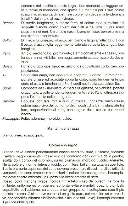 ciao a tutti gli amanti degli animali. Questo post é interamente dedicato al colombo PIACENTINO . animale originario dal paese di cui prende il nome,Piacenza. Questo è un colombo a mio parere molto bello con pochi difetti e di stile. Ottimo nella riproduzione della prole,può essere usato anche come balia per colombi come: romano,sottobanca modenese,mondano ecc. Disponibile oltre al classico comune colore bianco anche Nero,rosso,giallo. Di seguito c è la scheda completa Su di esso. Sono ben accetti commenti e foto a riguardo. Allegato: