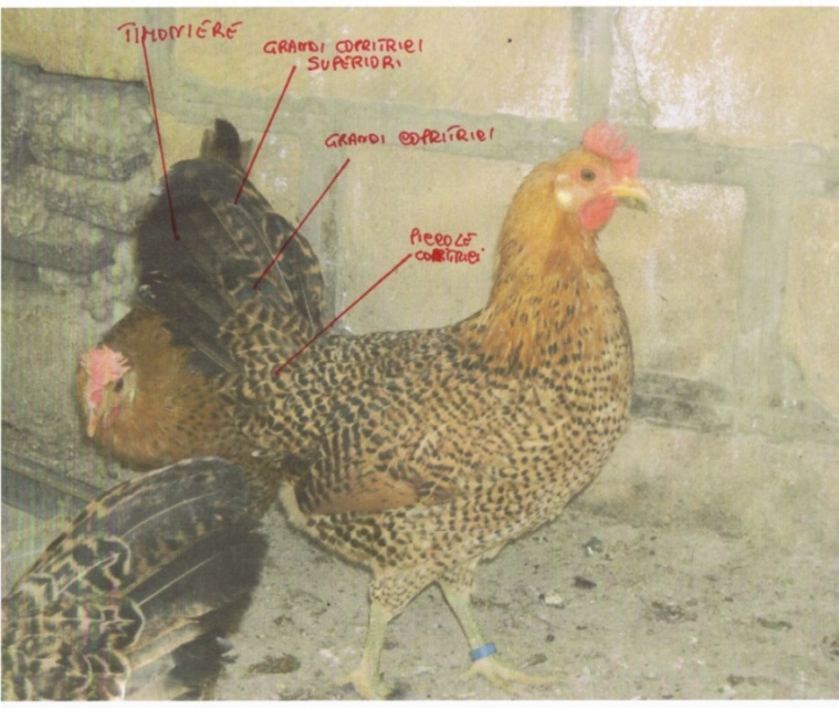 Penne della coda: 1) TIMONIERE 2) PICCOLE COPRITRICI 3) GRANDI COPRITRICI (con le due in alto GRANDI COPRITRICI SUPERIORI)