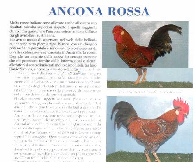 Benché nel luogo di origine questa selezione possa essere indicata con l'appellativo di Red Ancona è chiaro che questa non è la colorazione di questi soggetti . Forse sarebbe stato meglio eseguire una traduzione non letterale ed un adeguamento dei termini alla reale colorazione.