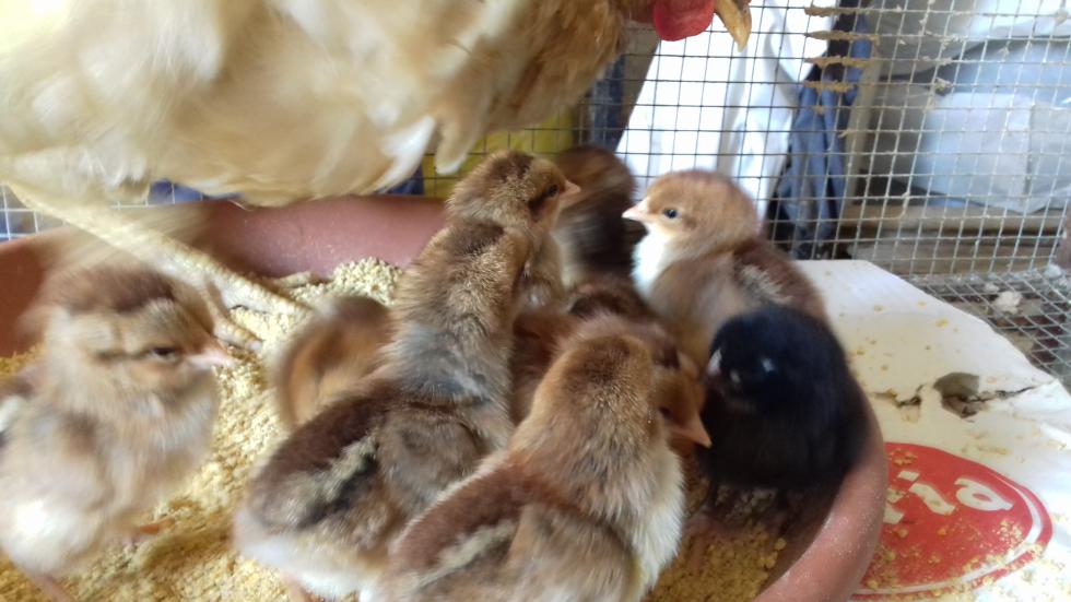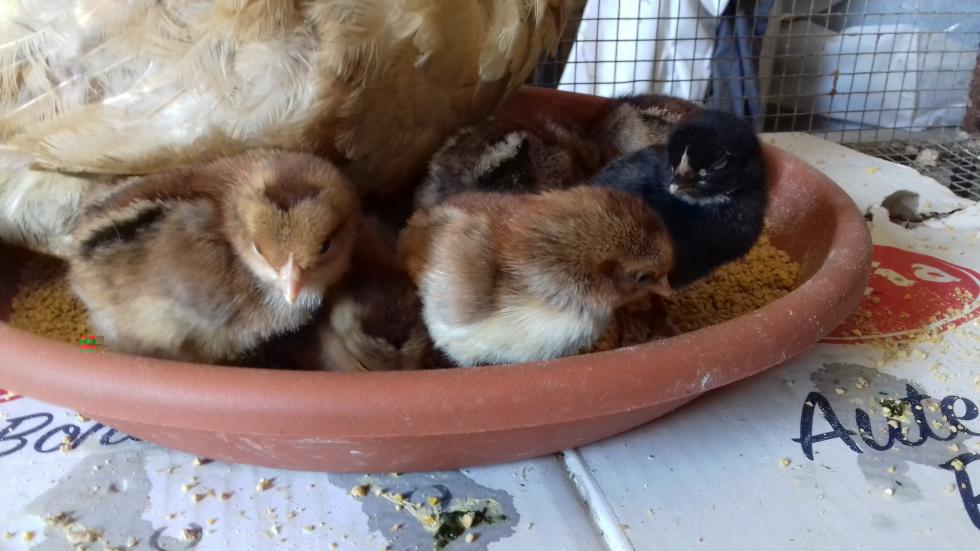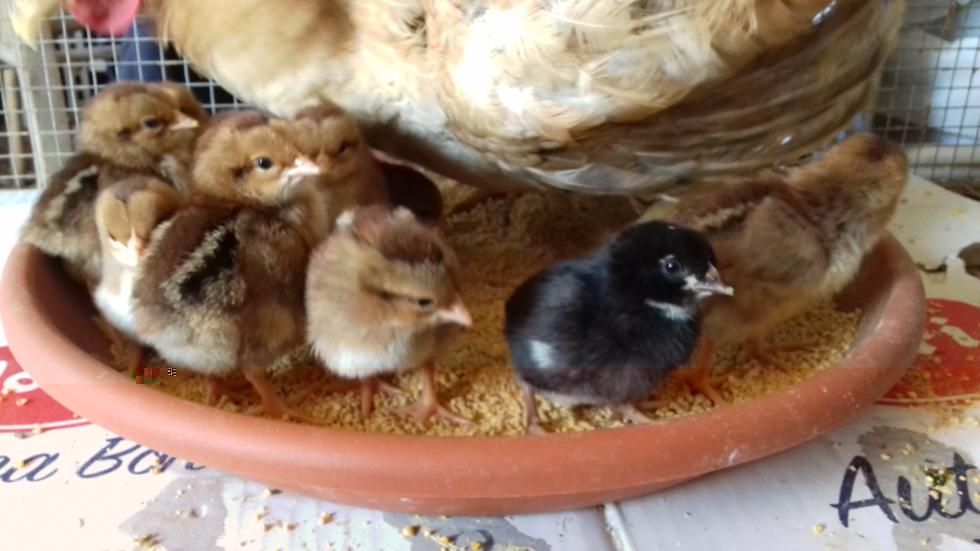 Buonasera a tutti, oggi come un orologio svizzero, la mia chioccia ha schiuso 10 pulcini su 13 uova (1 morto nell'uovo, uno chiaro e uno schiacciato dalla mamma). Il problema è che ne è nato uno quasi completamente nero :shock: