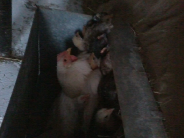 Ecco quà la livornese con i suoi 2 pulcini. Sarà che era la sua prima cova, ma è stata un pò maldestra  su 7 uova ne sono nati 4, ma 2 aimè sono morti dopo essersi schiusi  le altre 3 uova non erano feconde.  Raspa nella gabbia come un cartepillar, tanto che i pulcini devono stare attenti altrimenti vengono sparati come proiettili contro la gabbia.  Mi piacerebbe liberarli e farli razzolare liberi con la mamma, ma ci sono ancora delle pantegane in giro la notte che devo eliminare.  Appena saranno più grandicelli li libererò.