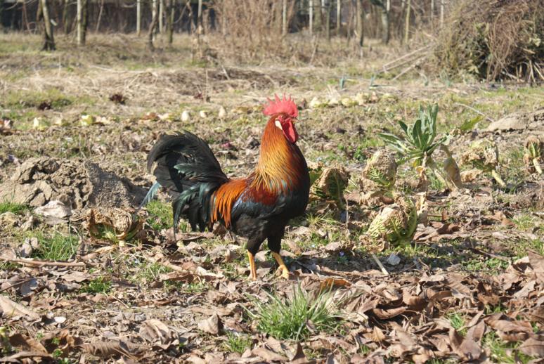 Pensando di fare cosa gradita e di risollevarmi il morale dopo la dipartita del mio amato Gallo, mio padre mi portò a casa un leghorn di ottime caratteristiche di razza: bel collo rosso che sfuma in chiaro sulle spalle, petto nero con iridescenze, becco e zampe gialle. Naturalmente esso presenta anche le peculiarità di forma e portamento che distinguono i leghorn dai livorno e che perciò categorizzo come "difetti" per il mio fine: dorso lungo, poco inclinato, coda nettamente staccata da esso, zampe troppo corte, nel complesso meno elegante. (Posterò foto appena ultimata la muta).