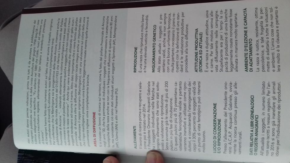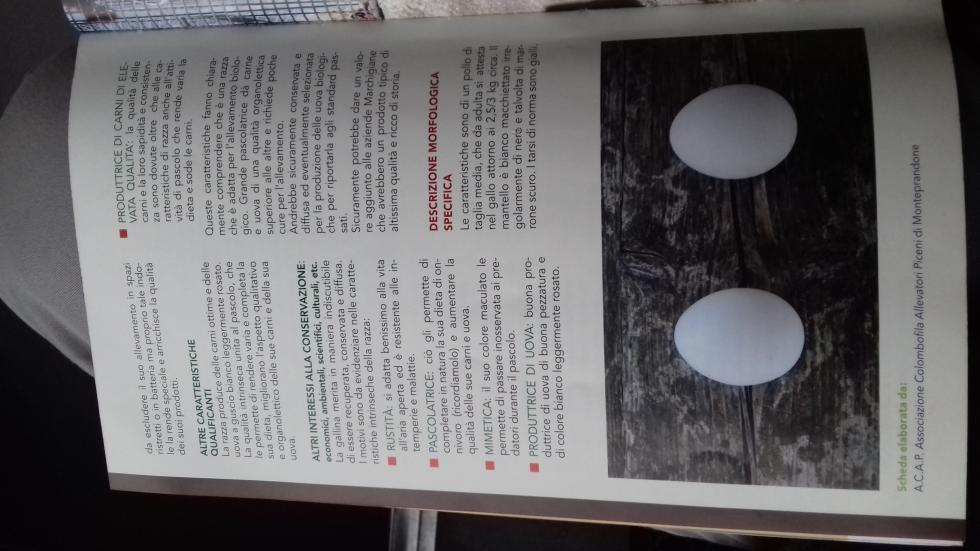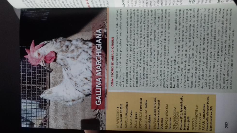 Buongiorno a tutti, ho aperto questo argomento per chiedere alcune cose. Oggi con la scuola abbiamo preso parte a una conferenza sulla biodiversità agricola. Nel corso di quest'ultima ci hanno fornito un libro con tutte le specie/razze autoctone (soprattutto piante, di animali sono presenti solo il cavallo del Catria, il coniglio gigante nero, due tipi di pecore ed appunto la gallina marchigiana) presenti nella regione marche. Chiedo ai più esperti, questa razza (scoperta da poco e non ancora riconosciuta), secondo voi può essere presa da qualche allevamento (parlo tramite uova) ed allevata? La conosce nessuno come razza? Allego le foto delle pagine del libro
