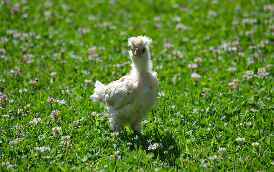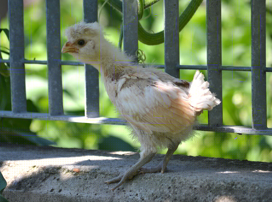 Ecco il mio pulcino di gallina padovana camoscio orlata bianco di 10 giorni nato da cova naturale. Sta già mettendo le prime piume sulle ali e sulla coda.