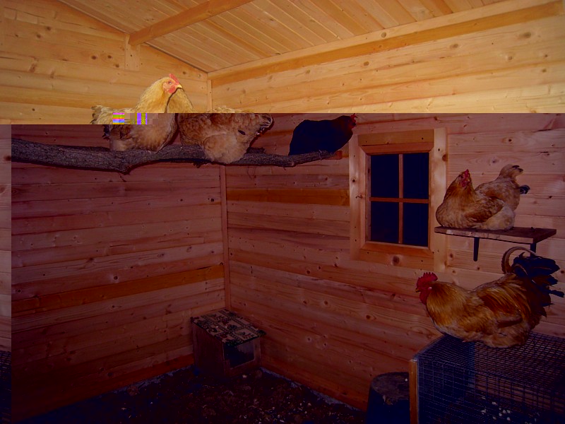 Il mio gruppetto 2012 si prepara per la notte. Manca una femmina che è in cova. La nera è una marans ramata che ho li' per dare una gallina in più al gallo e per non confondere le uova.