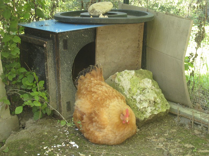 Lei fa parte di un gruppo di gallo + 5 galline che è tenuto temporaneamente in un recinto, in attesa che sia pronto il loro, in costruzione. Il giorno prima del trasloco, mi accordo che questa gallina inizia seriamente a covare, le metto sotto 11 belle uova e trasferisco il gruppo senza di lei che resta in santa pace per tutto il periodo della cova. In genere sficcanaso, controllo le uova e faccio la speratura ma non conoscendo la chioccia lionata, evito di invadere il campo, non si sa mai abbandoni la cova.