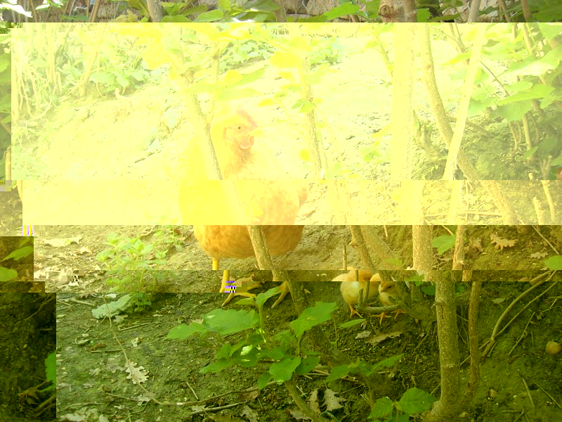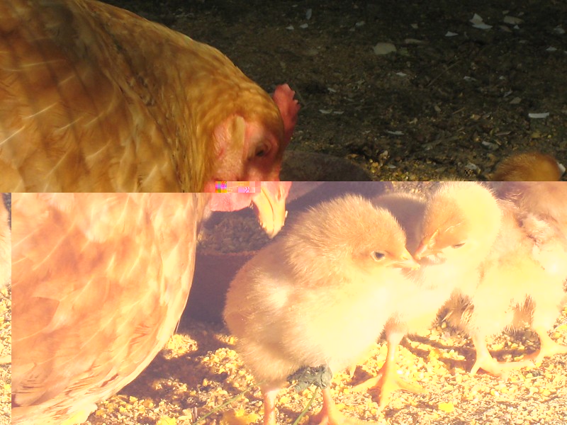 - tutte uova integre eccetto una il cui pulcino (interamente formato) è morto con la membrana bianca appiccicata addosso e il guscio interamente frantumato a mo' di puzzle e un'altra in cui il pulcino è mezzo fuori dal guscio ma è in grosse difficoltà. Prendo tutto e metto in incubatrice. Il 23 sera un altro buca, ho la sensazione che non si riesce a girare e che quell'uovo sia una trappola ma, come da manuale, aspetto il giorno dopo per vedere se ha fatto da se' e invece alle 8 del mattino del 24mo giorno il buco è identico. Apro delicatamente il guscio e con tanta attenzione da parte mia e gran fatica sua, alla fine nasce. Intanto la sera prima avevo aiutato a staccarsi dal guscio anche il primo, quello mezzo nato. Lascio tutto in incubatrice e la sera tardi del 24 metto i due piccoli sotto la chioccia. Quindi in totale siamo a 4: due nati bene e due così così.