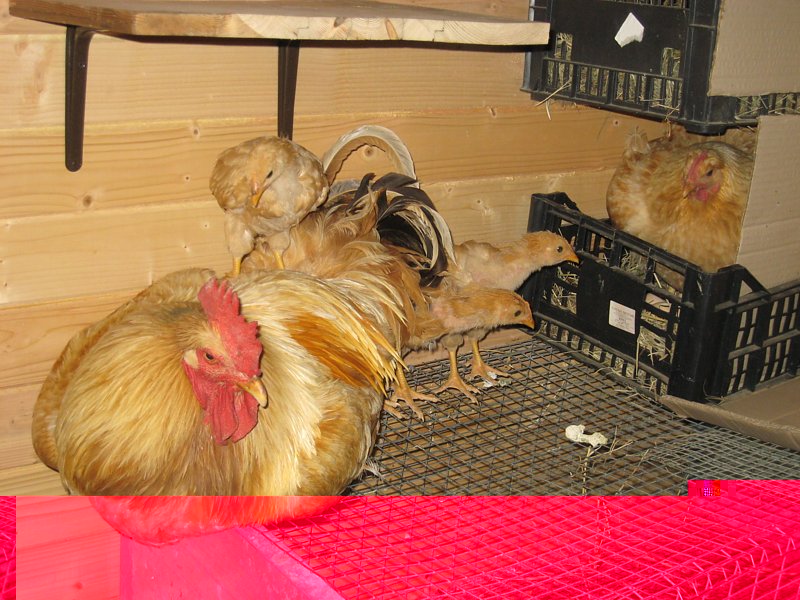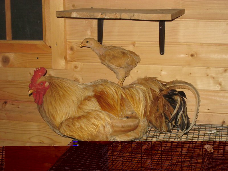 è sera, il gallo lionata va a dormire, i tre pulcinotti lasciati da molto tempo da mamma lio, corrono sotto le ali di papà che ha un debole per i piccoli e una gran pazienza. Quella dietro è una lionata iena in cova dal 5 luglio. Fa così caldo che si tiene sollevata sulle uova.. Una delle particolarità della Robusta Lionata a mio parere sono i galli. Ognuno con una sua precisa indole.