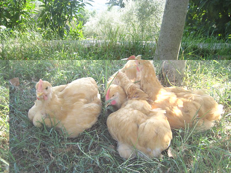 eccoli qui, tranquilli, caratteristica della razza. E' vero che le foto sono delle 15,30 di oggi, fa caldo e c'è un bel venticello. Loro fanno la siesta anzichè razzolare. Allegato: