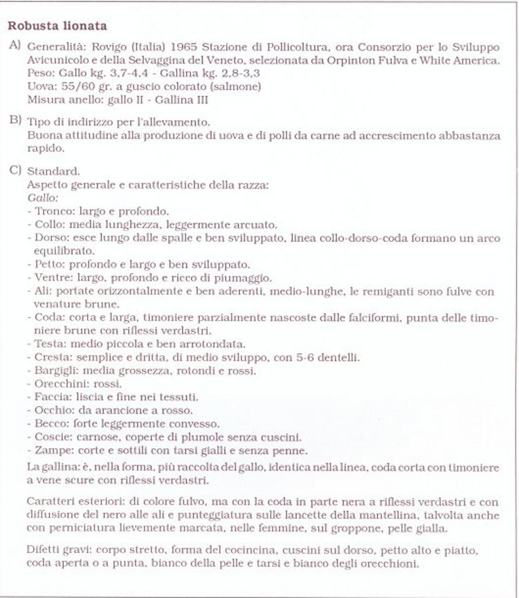 La Robusta lionata è una razza da reddito essendo inquadrata fra le razze a duplice attitudine . Il documento prodotto nel 1989 che descriveva questa razza è il seguente . Da li non si è fatto praticamente più nulla se non continuare ad allevare questa razza prima all'Istituto sperimentale di polllicoltura di Rovigo poi presso alcuni istituti agrari e presso allevatori privati , oggi tramite lo sforzo di molti piccoli allevatori fra cui ci siete anche voi