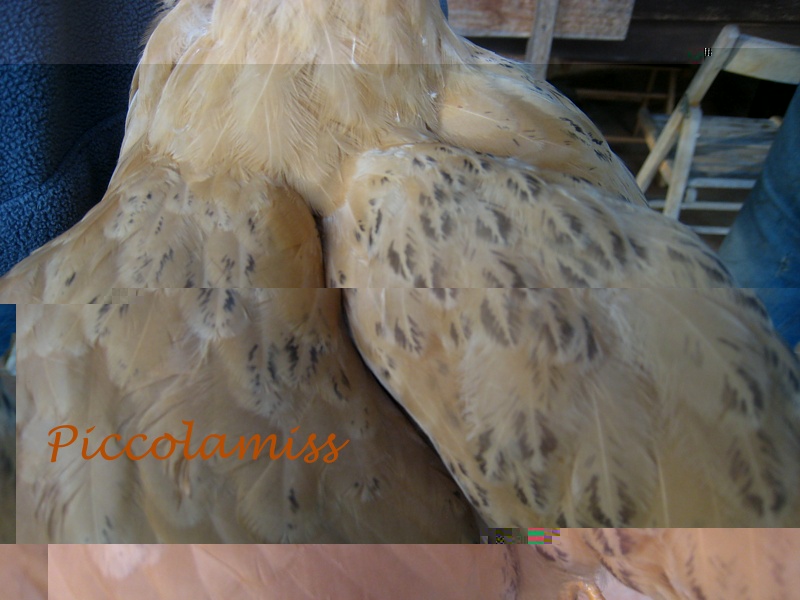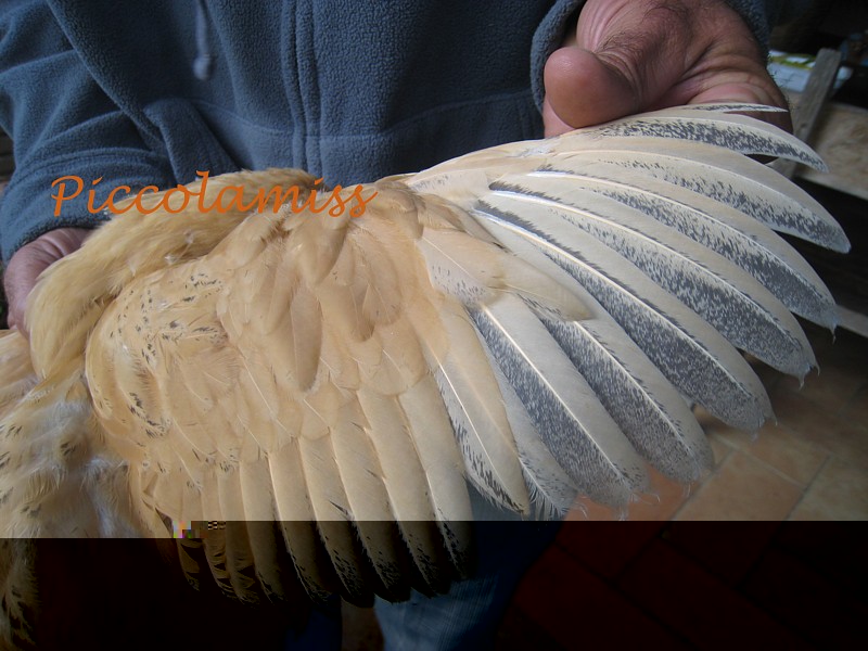 desidero mostrare come si presenta il piumaggio di un pulcinotto di Robusta Lionata di due mesi che alla nascita aveva i puntini sulla testa e le strisce sul dorso: Allegato: