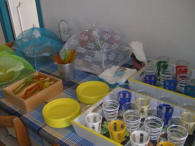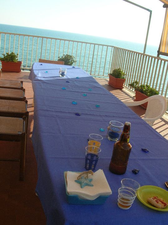 Ed eccola la tavolata all'esterno, già apparecchiata ...con la tovaglia color mare...che attende bicchieri, birra, piattini, cibo e tanti...tanti amici! Una giornata davvero meravigliosa, con sole spendido e mare calmo! Ciao