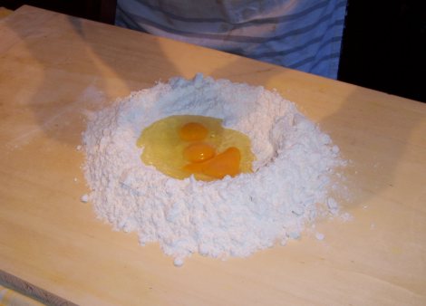 battere le uova amalgamando gradatamente la farina Impastare vigorosamente fino ad ottenere un impasto elastico ed uniforme. La sfoglia si può tirare a mano o a macchina, deve comunque essere molto sottile.