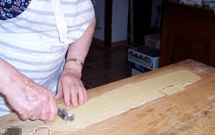Tagliare dei quadretti di pasta di circa 3 cm di lato o con la "spronella" o con l' apposito taglierino. Mettere una piccola quantità di ripieno al centro dei quadretti di pasta
