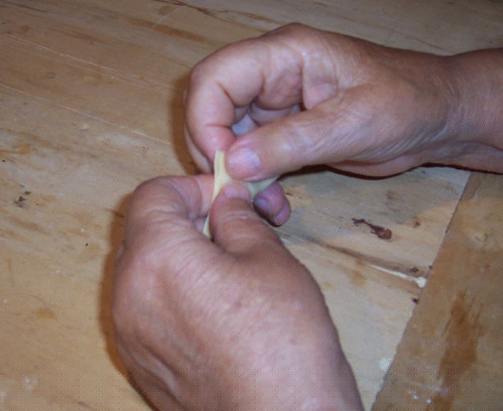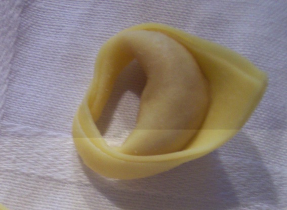 Piegare il quadretto sovrapponendo due angoli, stringere un poco la sfoglia per fare aderire la pasta facendoli girare intorno al dito e comprimere le due estremità per chiudere il tortellino ad anello
