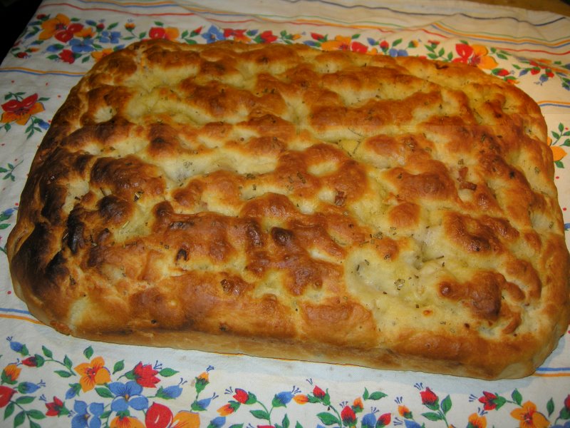 Ciao, per il momento ho rimandato la preparazione dei croissant, perché tra panettoni e dolci natalizi vari... mi devo disintossicare! Nel frattempo ho preparato la torta al formaggio che credo sia un piatto tipico umbro però non ho mai avuto l'occasione di mangiare l'originale in umbria. Ho un po' modificato una ricetta trovata su Internet ed il risultato è gustoso, non so quanto fedele o simile al piatto tradizionale. (Sicuramente c'è sul forum qualcuno dell'umbria: come vi sembra la torta? Ci assomiglia?) Preparazione: la sera ho preparato la pasta di pane (1kg di farina tra manitoba e 00 +2 cubetti di lievito di birra + 2 cucchiaini di sale + 2 cucchiai d'olio + acqua) e lasciato a lievitare tutta notte nel forno con la lampadina accesa. Alla mattina ho impastato metà di questa pasta con 4 uova intere, 100gr di strutto, 150gr di formaggio grattugiato tra grana e pecorino, una macinata di pepe. Ne viene fuori un impasto molto ma molto appiccicoso, tant'è che mi pareva di giocare... Comunque dopo aver impastato per un bel po' ho aggiunto altro formaggio a tocchetti, sempre pecorino e grana (per la verità ho riciclato la crosta del parmigiano). Infine nel forno a 170-180° per 40 minuti circa. Con la restante pasta invece ho fatto il pane ma questa volta mi è venuto di nuovo immangiabile....  Riproverò!! Ecco la torta.