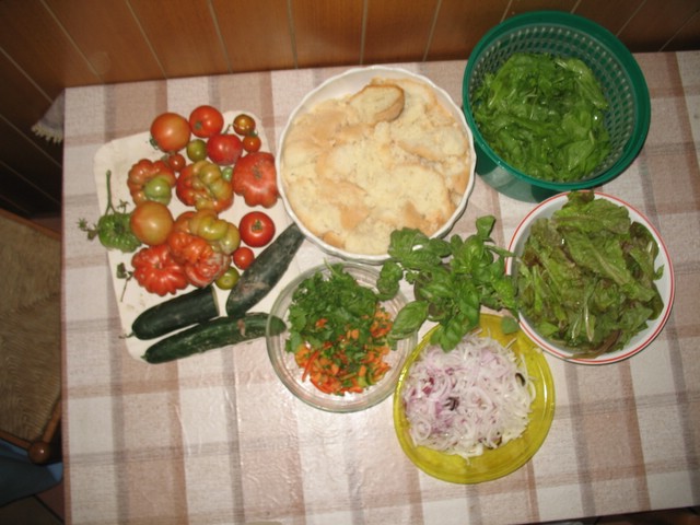 In tutta italia si fanno le zuppe anche se attulamnte sono un po fuori moda la mia ricetta di panzanella simile al quella di Miriap Panzanella Antica insalata toscana tipicamente estiva per la sua freschezza e per la presenza nell’orto di tutte queste verdure Ingredienti Pomodori, cetrioli, prezzemolo, rucola, peperoni, basilico, radicchi, cipolla rossa, lattuga pane toscano raffermo aceto olio sale mettere il pane raffermo a fette in una terrina con acqua e aceto al 50 % per alcune ore poi con le mani premere il pane per fare uscire il liquido e sbriciolarlo. Tagliare a piccoli pezzetti tutte le verdure accuratamente mescolarlo con il pane e condirlo con olio e sale. Lasciare riposare per un paio di ore prima di servire. Allegato: