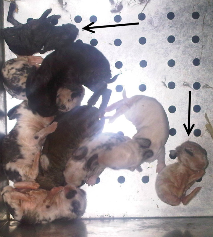 La situazione della nidiata, al momento è che dei 9 nati temo che 2 non ce la faranno. Sono quelli segnati dalla freccia. In particolare quello nero in alto nella foto è quello che ho trovato fuori dalla gabbia. Voi che ne dite?
