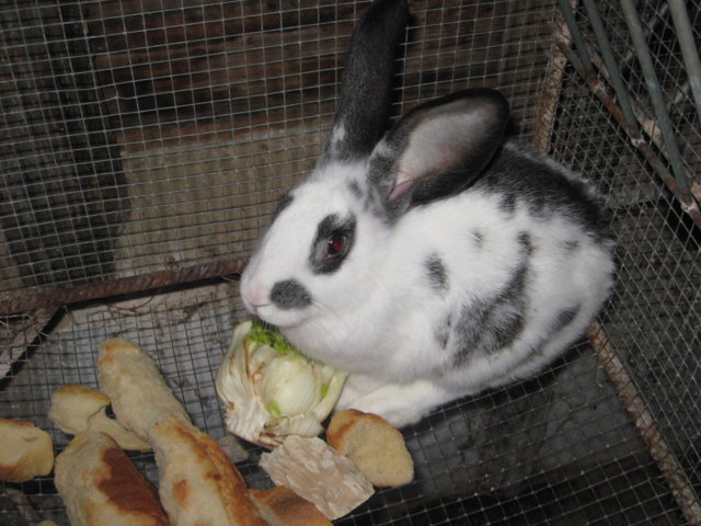 il fondo delle gabbie è tutto in rete?controlla le zampe del maschio.una bella lettiera di paglia e qualche ramo da rosicchiare sarebbe meglio di tutto quel pane.non esagerare nel mangiare con i conigli. ciao danilo