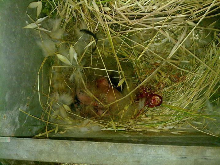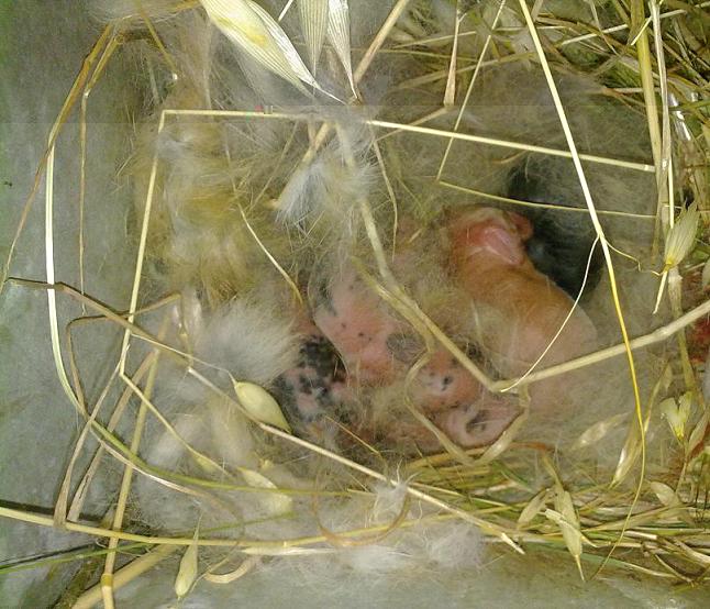 Ragazzi i conigli sono vivi...hanno messo il pelo e a momenti dovrebbero aprire gli occhi...la razza è un incrocio molto mirato...il padre è un pezzato(figlio di una californiana e maschio pezzato) e la madre ibrida da carne(figlia di una coniglia comprata ad una fiera che pesava 5/6 e il padre rosso di nuova zelanda). Vedremo se cresceranno molto velocemente!!!