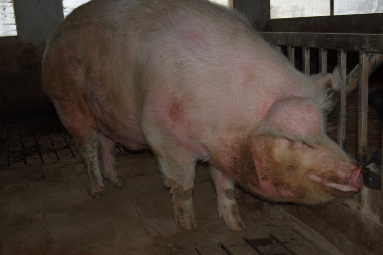 Coccolone è un Large Wite, di quasi tre anni, da circa sei mesi è ormai stabile di peso, e l'allevatore che gli sta affianco è alto unoesettanta.