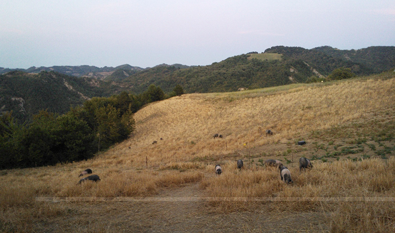 spiego il mio caso....ho una serie di recinti di circa 3/4 ettari cada uno....alcuni di puro bosco "castagni, roverelle, cerri, carpini"....altri pascoli arbustivi e altri seminativi....in questi è difficile farvi arrivare la trebbiatrice......io lascio che liberamente le mie cinte possano stare di giorno nei boschi e la sera-mattina nei capi coltivati senza mettere cancelli o spostarle.....quest'anno ne avevo alcuni con orzo e favino e altri con mais nano rosso....in questa maniera guadagno anche tempo....non mi devo preoccupare per un periodo di governare i suini...e vedo che l'allevamento è equilibrato e i suini sono molto tranquilli e rilassati....dopo che finiscono la granella cominciano con i germogli di orzo...poi chiudo i campi e semino...questa volta pensavo avena e favino in alcuni e mais in un altro......per l'inverno mi conviene comprare i campi in piedi dai vicini perchè se devo trebbiare i miei mi costa uguale o anche qualcosa in piu....capisco che le farine rendano meglio...ma...io lascio fare ..le cinte si abituano, sono delle brave pascolatrici...a me piace vedere la sera che escono dal bosco e si dirigono in un campo coltivato che si trova su di un crinale che domina la vallata..diventano padroni di quel paesaggio...gli danno armonia...io è cosi che voglio vedere i miei maiali...poi troverò l'energia di quell'annata in quei salumi che aprirò l'anno successivo.