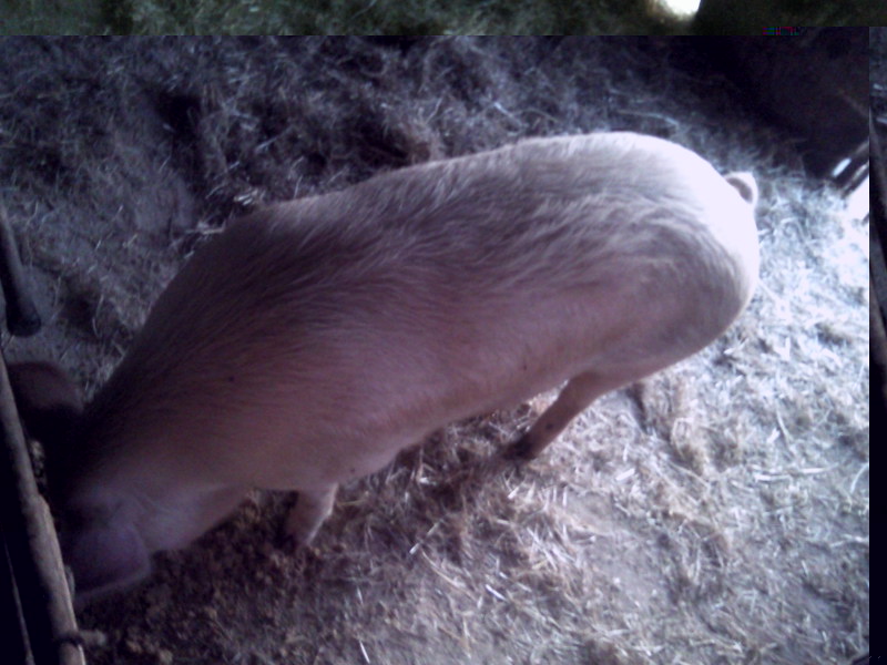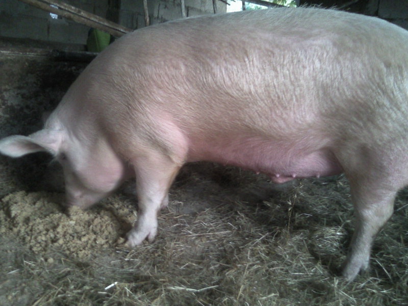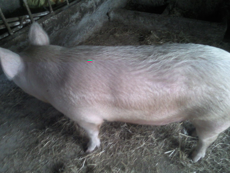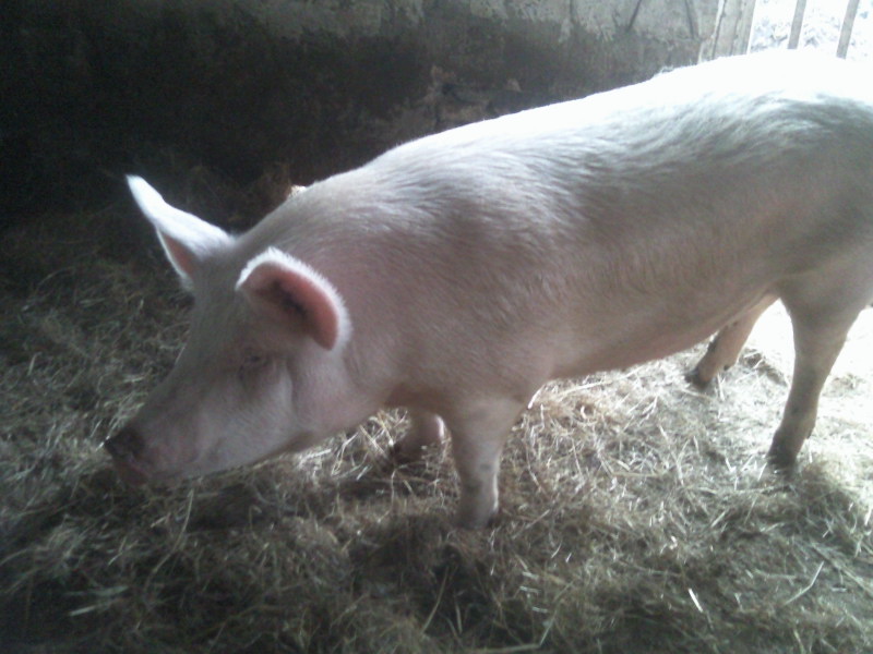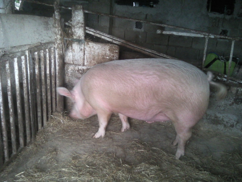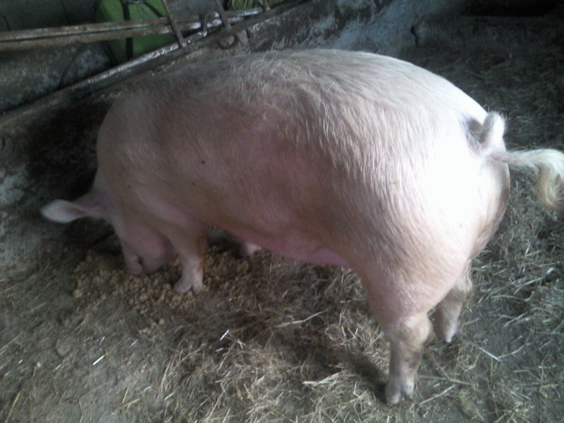 Potrebbe essere un Large White o un suo incrocio con una razza bianca, comunque bello, saluti, Mario