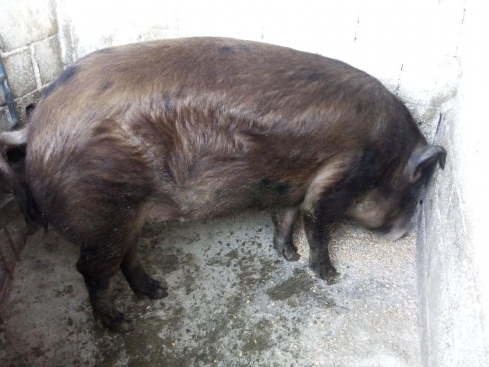 In questo momento ho due scrofe, la più adulta è Rossella del peso di circa 250kg età 17 mesi, figlia di un verro Duroc anas e di una scrofa meticcia, ha già fatto un parto con ottimi risultati 9 suinetti macellati a 30 giorni con un peso moreto pulito di 8/9 kg a suinetto,