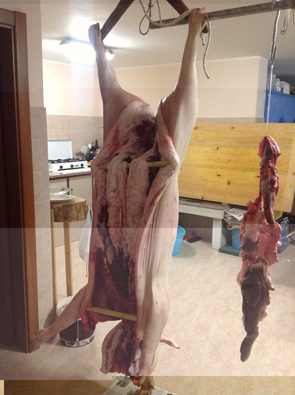 No, le strisce di cotenna sono quelle nel file a40.jpg....quelle da voi indicate sono da noi chiamate in dialetto "Noglje"..praticamente sarebbe il budello accuratamente lavato e sgrassato sotto acqua calda corrente, tenuto qualche giorno in salamoia e all'interno vi si mette la trippa condita con alloro, peperoncino, bucce di arancia ecc, vanno poi essiccate (possibilmente al vento caldo) per circa una settimana e mangiate poi cosi crude o fritte ecc, non so se sono in uso nelle zone vostre. Altra cosa tipica è la gelatina della quale in una delle foto si vede parzialmente ancora non ultimata..sarebbe praticamente carne bollita per 4 ore (testa, stinco, coda, orecchie, un po' di cotenna) tutta bella poi dissossata messa in contenitori di pirex adatti ad andare su fiamma in quanto poi vi viene aggiunta in percentuali specifiche il brodo del bollito e l'aceto..in pratica per rendere l'idea alla fine diventa come una Simmenthal ossia carne con gelatina. Sarei curioso di sapere se queste cose da voi sono in uso o comunque anche se non oggi se lo erano anticamente