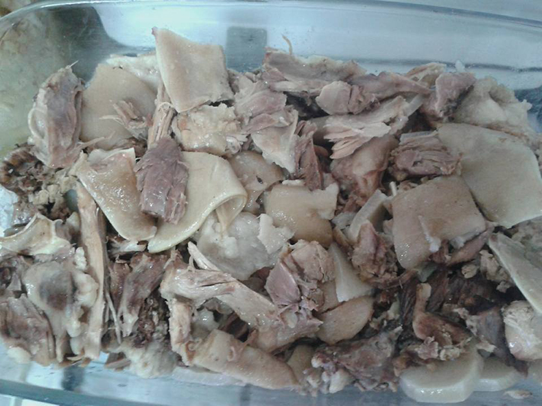 JeanGabin ha scritto: La gelatina di cui parli è la sugna, o strutto? né l'una né l'altra, come scrivevo già sopra la gelatina si ottiene bollendo parti quali la testa fatta a pezzi, piedi, stinchi, coda, orecchie, schiumando di continua la pentola per togliere le impurità che vengono fuori durante la cottura (grumi di sangue, schegge di ossa). Dopo le 4 ore di bollitura viene presa tutta la carne togliendola dalle ossa e facendola a pezzetti unitamente a orecchie pezzi di cotenna ecc e viene il tutto sistemato in un contenitore di vetro pirex e/o cmq idoneo ad andare su fiamma. In questo contenitore sulla carne viene versato il brodo di cottura unitamente ad aceto e ciò da vita ad un processo dove si crea una gelatina che ti darà un prodotto finale per farti capire simile alla simmenthal (carne e gelatina)