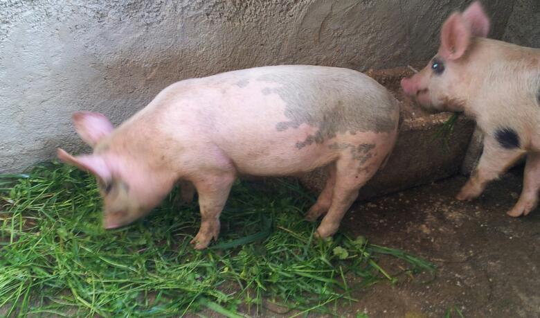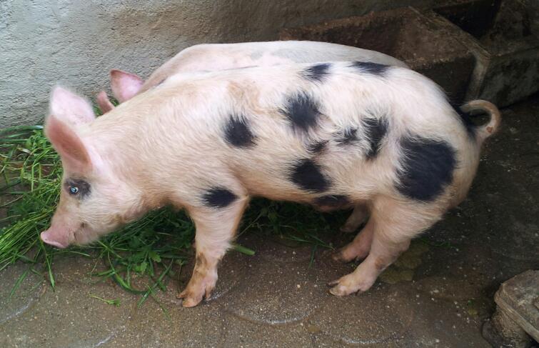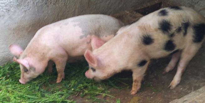 Secondo me saranno sui 3 mesi. Quello con la macchia grigia dietro credevo fosse un borghigiano e l'altro l'avevo identificato come un pietrain o affine...