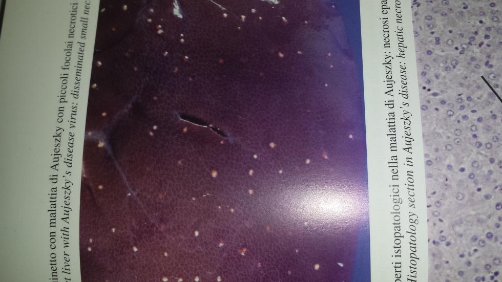 Sull'"Atlante di patologia suina" c'è una foto con un fegato di un suinetto con piccoli puntini bianchi disseminati. La didascalia spiega che sono piccoli focolai necrotici dovuti alla malattia di Aujeszky. Non essendo veterinario ti riporto quello che c'è, le possibilità sono più di una, in ogni caso non lo mangerei.