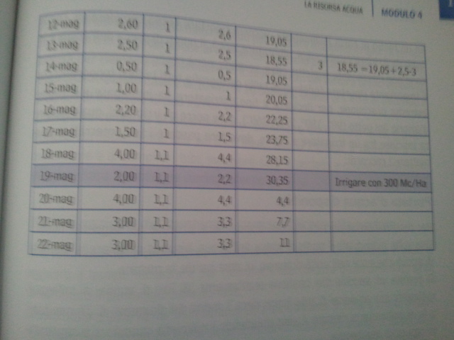 Perciò anche l'evaporazione su ettaro ? ogni ettaro di terreno evaporano 4 mm di acqua?? Scusi posso chiederle anche un ultima cosa che non riesco a spiegarmi ?? Per quale motivo nell'immagine presente nel mio libro dice di irrigare nel momento in cui i valori di H20 sono prossimi a 30 mm (o almeno mi sembra che voglia dire questo ) )