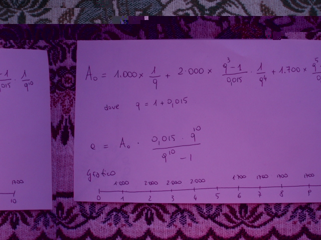 Ciao Marco> Sono un nuovo iscritto, perito elettrotecnico, professione ferroviere ma > ho> difficoltà a risolvere il seguente esercizio:> SI PATTUISCE DI ESTINGUERE UN DEBITO IN PIU’ ANNI, SUDDIVIDENDOLO NEI> SEGUENTI IMPORTI A PARTIRE DA OGGI:> € 1000 TRA 1 ANNO> € 2000 ANNUE, DAL 2° ANNO PER 3 ANNI> € 1700 ANNUE, DAL 6° ANNO PER 5 ANNI> CALCOLARE L’ACCUMULAZIONE INIZIALE DEGLI IMPORTI E L’ANNUALITA’ MEDIA IN > UN> DECENNIO (r = 1,5). Grazie (scusami ma è la prima volta che partecipo ad un forum)