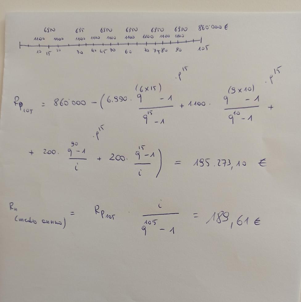 Un collega mi ha spedito questo esercizio: Un bosco fornisce a fine ciclo (105 anni di età), un reddito di 860000 euro. Per lavori di coltivazione e diradamento si spendono: 6950 euro ogni 15 anni, 1100 euro ogni 10 anni e 200 euro ogni anno. Negli ultimi 15 anni si hanno solo spese fisse di 200 euro annue. Calcolare reddito netto a fine ciclo e reddito netto medio annuo (r=3.5%).