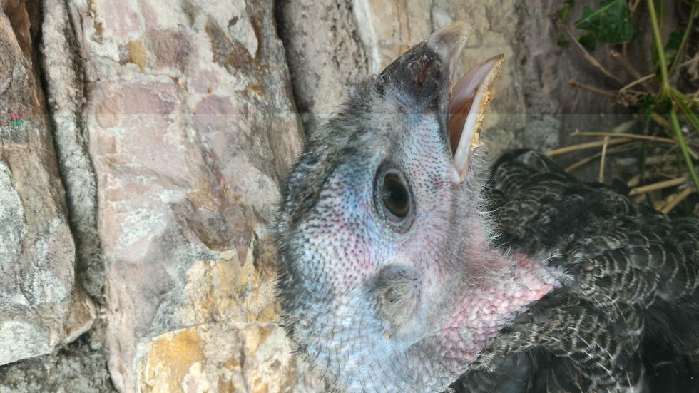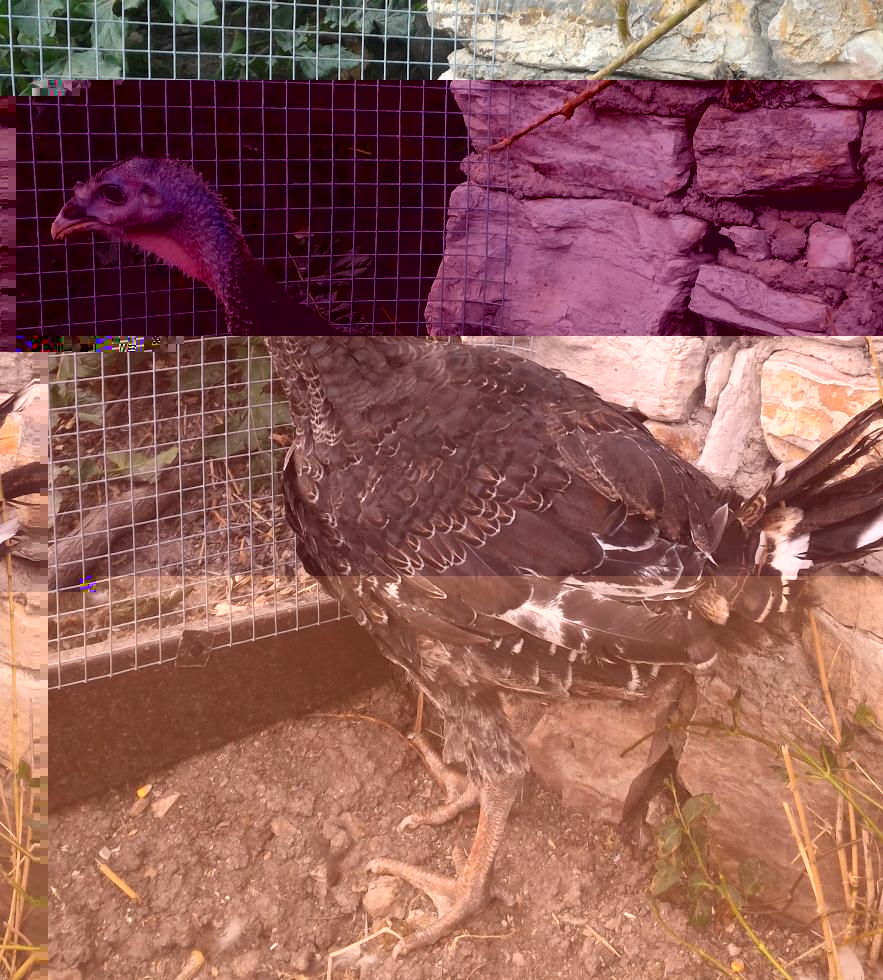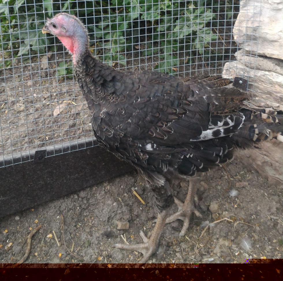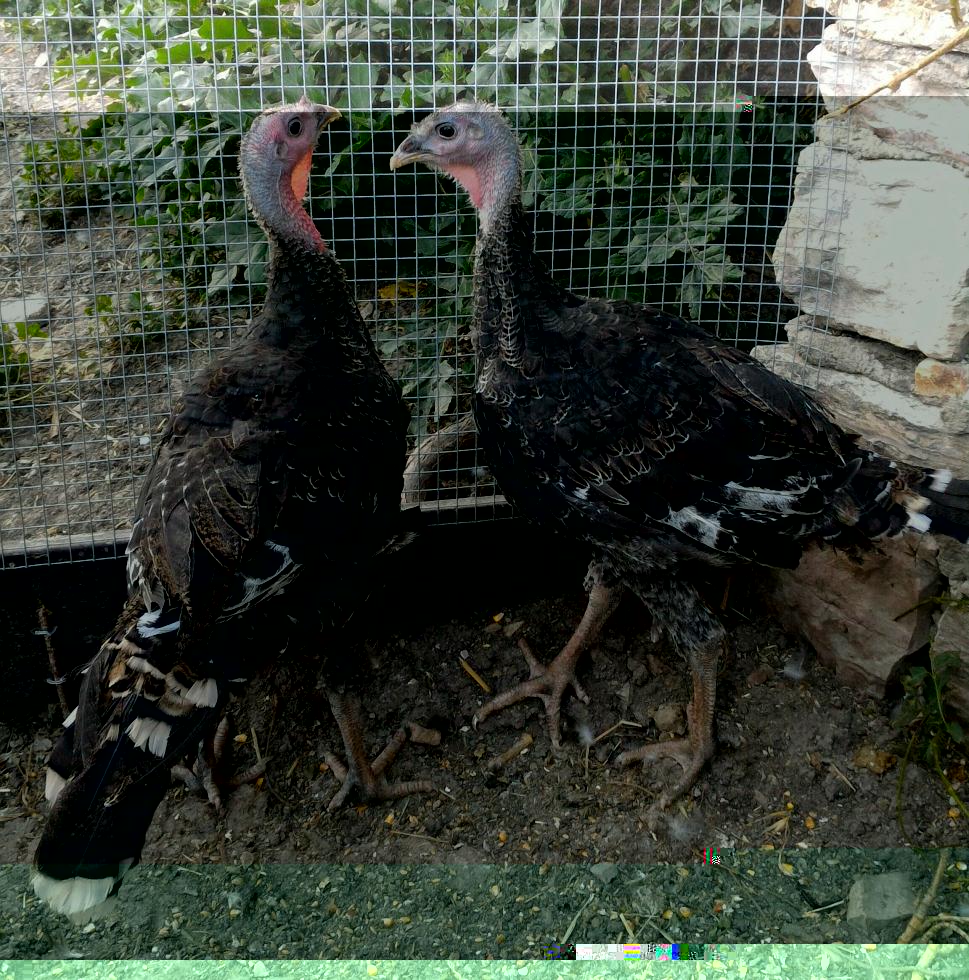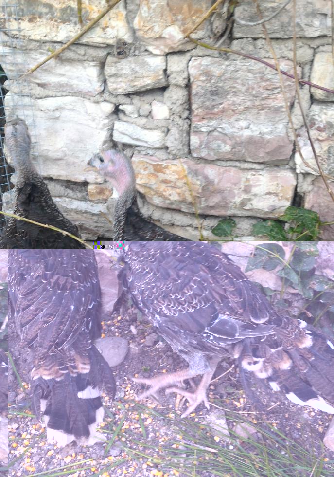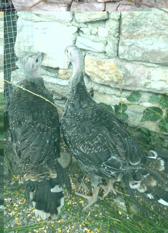 I tacchini adesso hanno 2 mesi, pesano uno 2,4 chili e l'altro 2,5 chili. La differenza di peso sta a significare che uno è maschio e l'altro è femmina o uno è sottomesso dall'altro, sta di fatto che di mangime ne hanno a volontà.
