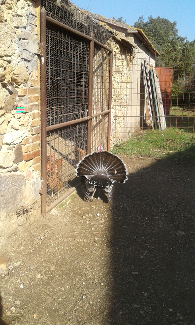 La sua aggressività è ulteriormente aumentata: quando lo libero si mette davanti al cancello del pollaio dove sono chiuse le galline e fa la ruota, con dei strani versi gutturali per tutto il tempo, fossero pure delle ore.