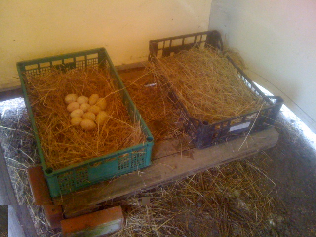 allora visto che non ho avuto risposte dal forum, ho fatto cosi:ho tolto le uova ,ne ho lasciato 1,dopo 4 giorni ho trovato la tacchina che covava (non era quella che ho visto accoppiarsi); aveva solo 5 uova....ho preso le uova che avevo conservato e lo messe sotto,totale 12 uova.Ora mi chiedo,saranno fertili? ,ho visto solo una tacchina accoppiarsi,in 15 giorni deposto 12 uova.Vi allego delle foto, e se mi confermate che razza sono.grazie. Un'altra cosa,secondo voi nella cassetta a fianco andrà a deporre l'altra tacchina???