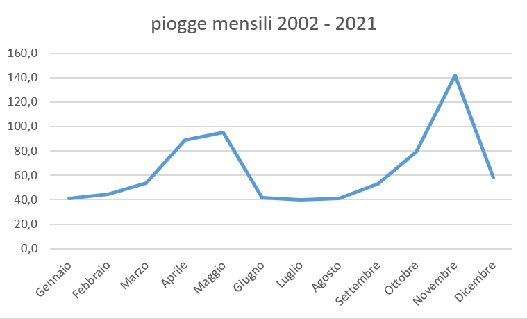 Piovosità media annua sempre più ridotta. I dati sono del periodo 2002-2021. Mediamente in questo periodo sono circa 800 mm/anno. Allego anche il dato delle temperature. Ciao