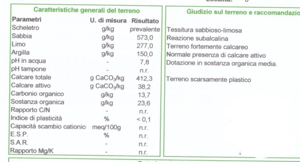 Buonasera a tutti,sono nuovo del forum. Avrei intenzione di realizzare un impianto,in Abruzzo, su un piccolo appezzamento di terreno,poco meno di un ettaro,esposto a sud / sud est,zona collinare h 500m ca slm. allego le analisi effettuate prelevando campioni a ca 50 cm di profondità. Voi cosa mi suggerireste? Grazie a tutti in anticipo