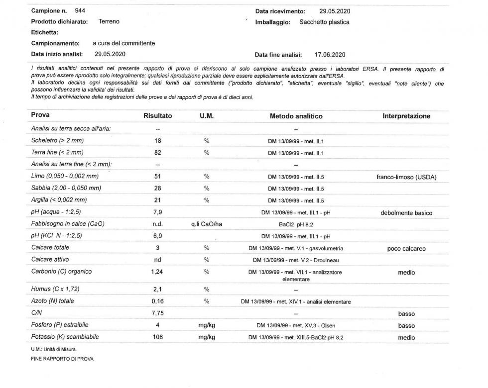 Presenza di calcare decisamente bassa , anche il ph in KCL. Il terreno se in zona idonea andrebbe corretto con abbondante carbonato......... Per quanto riguarda la piovosità andrebbe individuato per bene la zona. Qui in friuli la pioggia non manca in media, ma alcune zone della pianura soffrono parecchio nel periodo estivo......