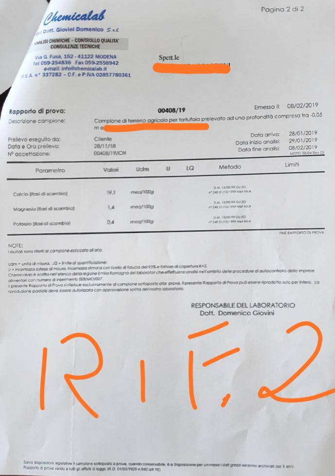 Buongiorno a tutti! Sono iscritto da parecchio tempo al Forum seppur non ho mai interagito direttamente. Avrei bisogno di qualche dritta per giudicare le analisi che ho fatto ad un terreno dove ho intenzione di creare una tartufaia. Ho provato a spulciare tra i vecchi post per riuscire a farmi un'idea e i risultati non mi sembrano male.. In allegato troverete due analisi distinte in quanto ho fatto due prelievi. Uno su due lati del quadrato adiacenti a della vegetazione dove raccolgo abitualmente scorzone, l'altro prelievo invece fatto su gli altri due lati che confinano invece con altri pezzi di prato. credo però ci saranno da fare delle lavorazioni per migliorare certi valori e per questo avrei sicuramente bisogno dei vostri graditi pareri e consigli.il terreno si trova a 800 m nell'Appennino Emiliano in una zona fortemente vocata e con scorzone che cresce praticamente ovunque intorno a questo campo. L'orientamento è nordest è la superficie è di poco più di un ettaro. Grazie a chi vorrà dire la sua! P.s. Le analisi relative al Rif.1 sono quelle fatte ai margini del campo vicino agli alberi che già producono, quelli invece relative al Rif.2 sono quelle fatte sugli altri due lati che confinano con altri prati