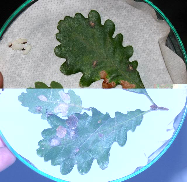 Circa la patologia fungina non so dirti con sicurezza quale sia l'agente eziologico. Rovistando nel mio archivio ho trovato una sintomatologia del tutto analoga a quanto vedo sulla tua foto, ma all'epoca non riuscii a determinare il fungo implicato perché non sporulò e dunque non fui in grado di effettuare esame microscopico (come vedi dalla foto allegata provai anche a porre il campione in camera umida senza però ottenere evasione del fungo; per inciso i chicchi di riso con la calandra sulla sx della piastra non centrano ovviamente nulla con le maculature, erano lì solo perché volevo fotografare). Dal tipo di macchia mi sentirei di escludere sia l'antracnosi da Apiognomonia quercina sia Mycosphaerella sp.; andando semplicemente per confronto di immagine in rete si trovano quadri similari da Tubakia dryina ma si tratta di un fungo che attacca prevalentemente la quercia rossa (è una malattia che sto seguendo da più di un anno ma ancora non sono riuscito ad avere riscontro microscopico), dunque non mi sento di sbilanciarmi.